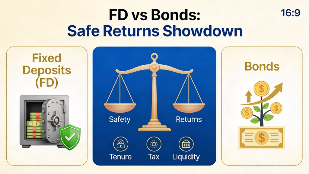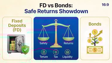 Fixed Deposits (FDs) and bonds are two safe ways to grow money in India, but they work differently for different goals. FDs give bank-guaranteed returns, while bonds pay fixed interest from governments or companies with chances for better yields but some extra risk.